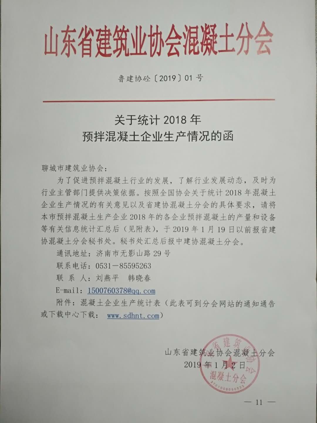 請(qǐng)各混凝土企業(yè)于2019年1月16日前將生產(chǎn)統(tǒng)計(jì)表發(fā)送至聊城市建筑業(yè)協(xié)會(huì)郵箱。郵箱地址:lcsjzyxh@qq.com聯(lián)系電話:8310706通知公告