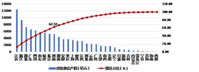 跨省完成建筑業(yè)總產(chǎn)值排名前兩位的是江蘇和北京,分別為 5430.59 億元和 3774.95億元。兩省跨省產(chǎn)值之和占全部跨省產(chǎn)值的比重為 26.87%。浙江、湖北、福建、上海、廣東、湖南、四川、河南、山東、陜西和江西11個(gè)地區(qū),跨省完成的建筑業(yè)總產(chǎn)值均超過 1000 億元。