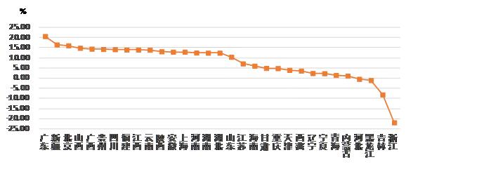 從各地區(qū)建筑業(yè)總產(chǎn)值增長情況看,有 27 個(gè)地區(qū)的建筑業(yè)總產(chǎn)值較上年同期有不同幅度的增長。其中,廣東、新疆、北京的增幅均超過 15%。有 4個(gè)地區(qū)出現(xiàn)負(fù)增長,其中,浙江出現(xiàn)了 超過20% 的負(fù)增長(圖 2)。