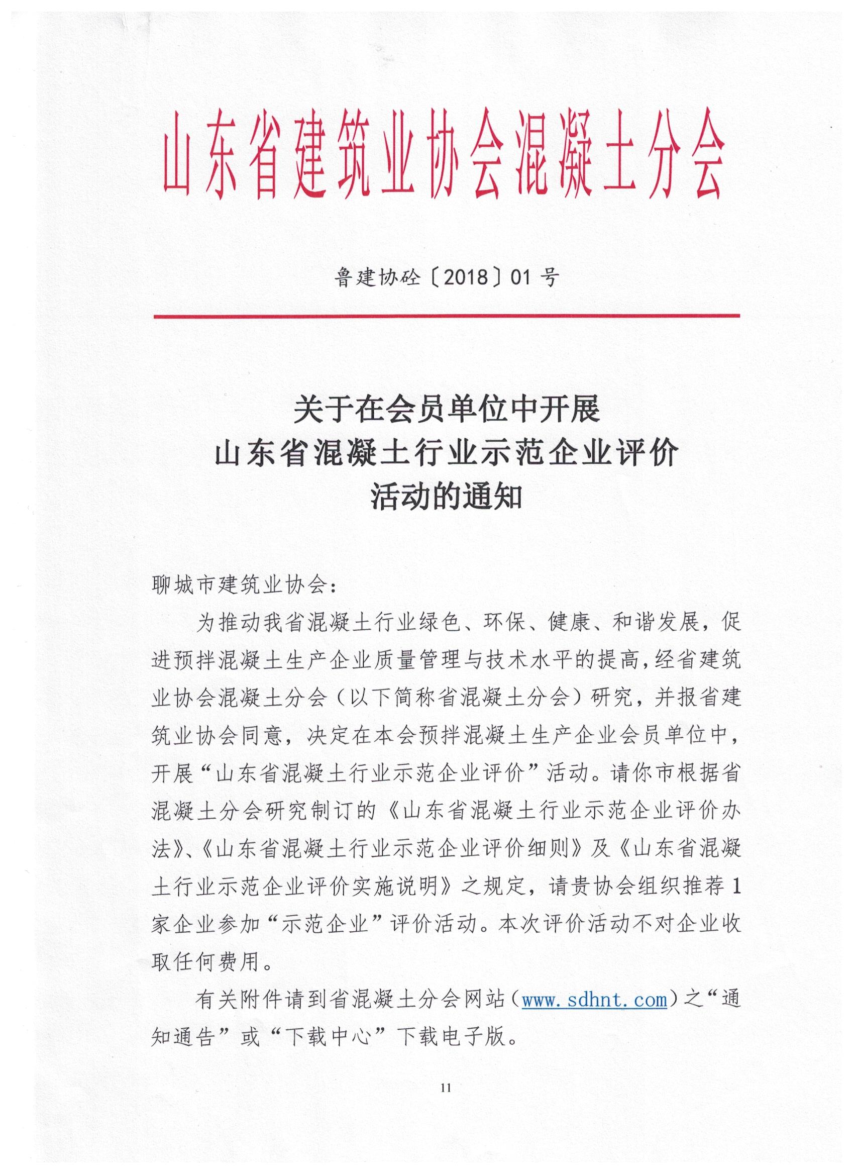 各會(huì)員單位: 山東省建筑業(yè)系會(huì)混凝土分會(huì)正在開展“山東省混凝土行業(yè)示范企業(yè)評(píng)價(jià)”活動(dòng),聊建協(xié)將推薦我市企業(yè)參加“示范企業(yè)”評(píng)選。這將對(duì)我市預(yù)拌混凝土生產(chǎn)企業(yè)質(zhì)量管理和技術(shù)水平的提高起到極大的促進(jìn)作用,且獲得“示范企業(yè)”的單位,將具備推薦參評(píng)“中國混凝土行業(yè)優(yōu)秀企業(yè)”的基本條件?,F(xiàn)將具體參選條件和其他事項(xiàng)公布如下,望達(dá)到標(biāo)準(zhǔn)的企業(yè)積極申報(bào),擇優(yōu)推薦。 一、我市建筑業(yè)協(xié)會(huì)會(huì)員; 二、企業(yè)須為省混凝土分會(huì)3A級(jí)以上的“信用企業(yè)”; 三、通過GB/T19001-2008(ISO9001-2008)質(zhì)量體系認(rèn)證,評(píng)價(jià)單位與認(rèn)證單位名稱一致,證書在有效期內(nèi)。 四、申報(bào)企業(yè)必須對(duì)申報(bào)材料的真實(shí)、有效性負(fù)責(zé)。凡因提供虛假材料、證明或證書而騙取“示范企業(yè)”榮譽(yù)的,一經(jīng)查實(shí),省混凝土分會(huì)將對(duì)其通報(bào)批評(píng),并取消參加下屆評(píng)價(jià)資格。同時(shí),由市建協(xié)負(fù)責(zé)將其“示范企業(yè)”證書、牌匾收回,取消其稱號(hào)。